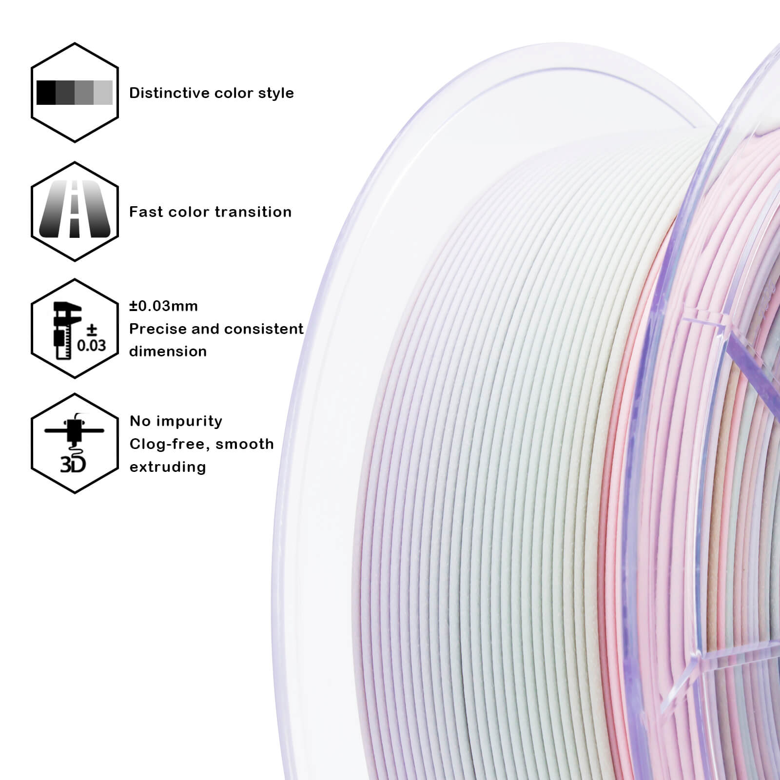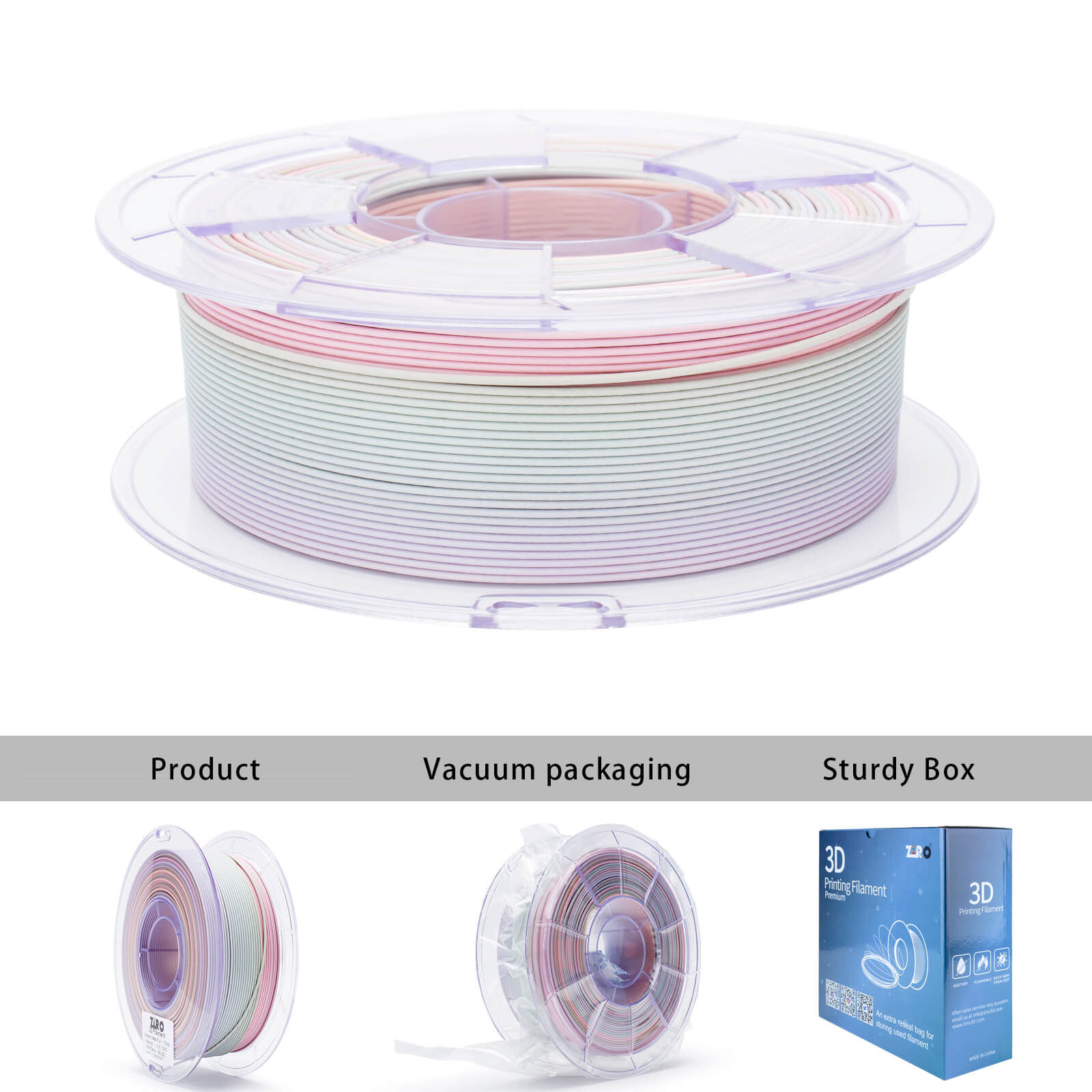 Very smooth printing filament straight out of the box. Love Ziro filament. Transition was rapid, more than I prefer, but it was clear in the description. Performed perfectly straight out of the package. Beautiful colors. But, that being said, the colors were MUCH brighter than image shown. I made many beautiful items. Just not the ones I purchased the filament to make. Quality was great. Color was not what I expected from the images. Beautiful, but still, I wanted muted colors and received vivid colors.