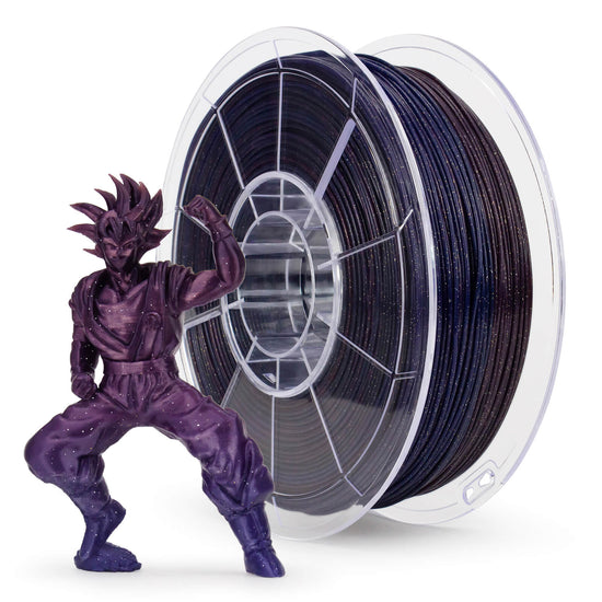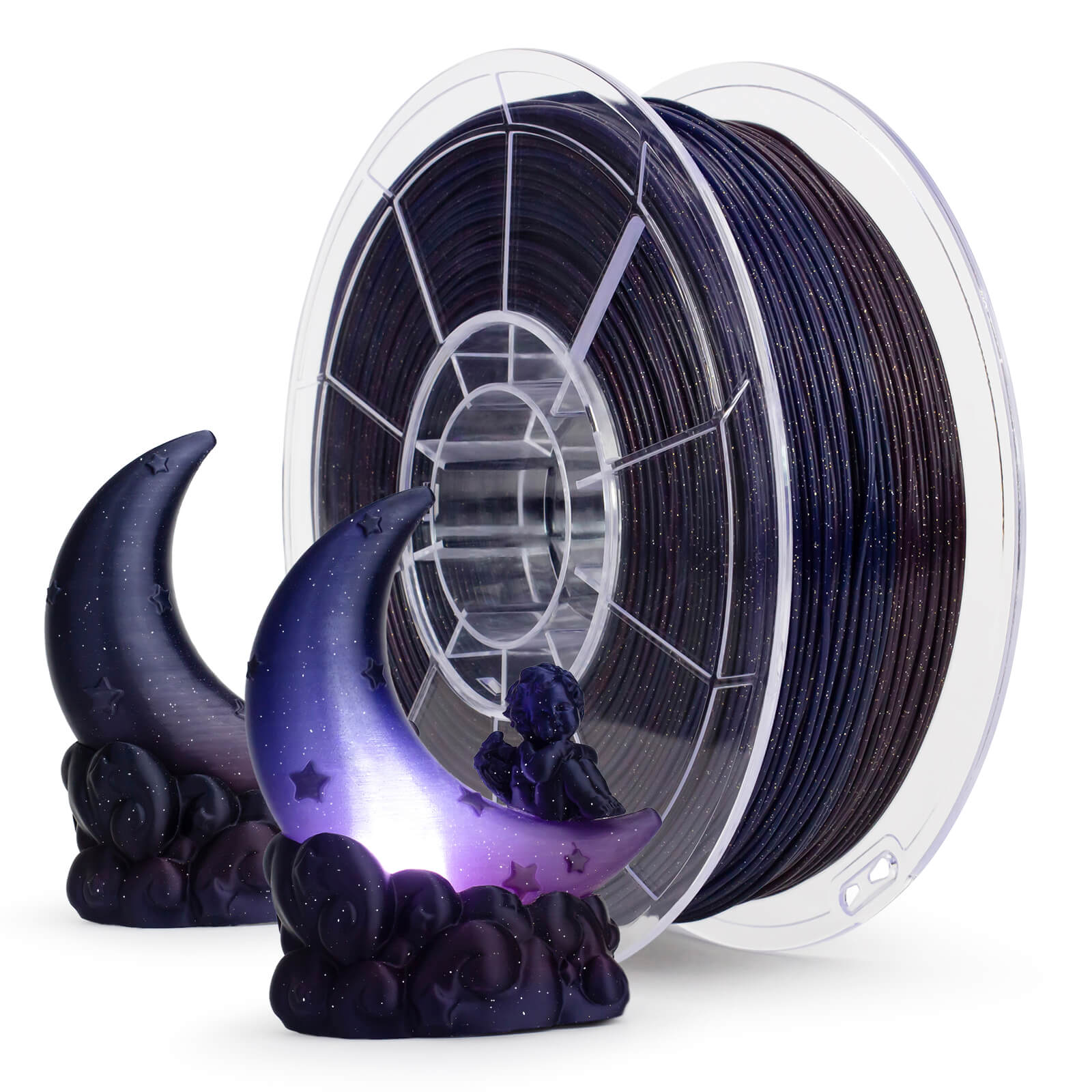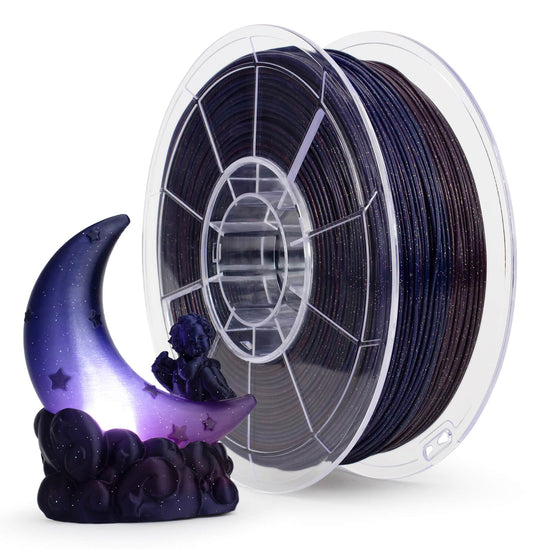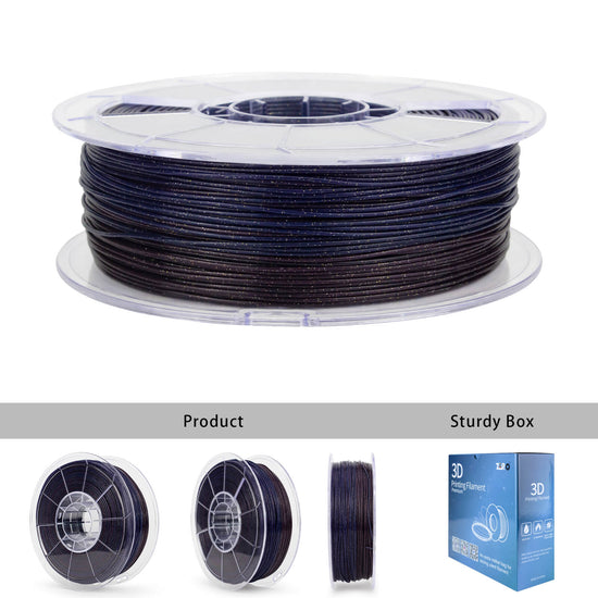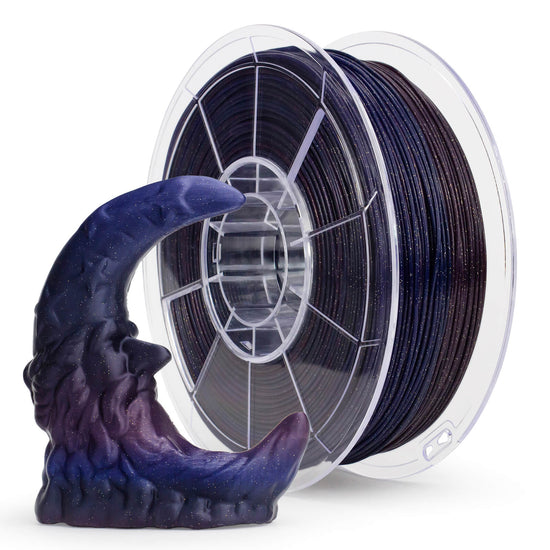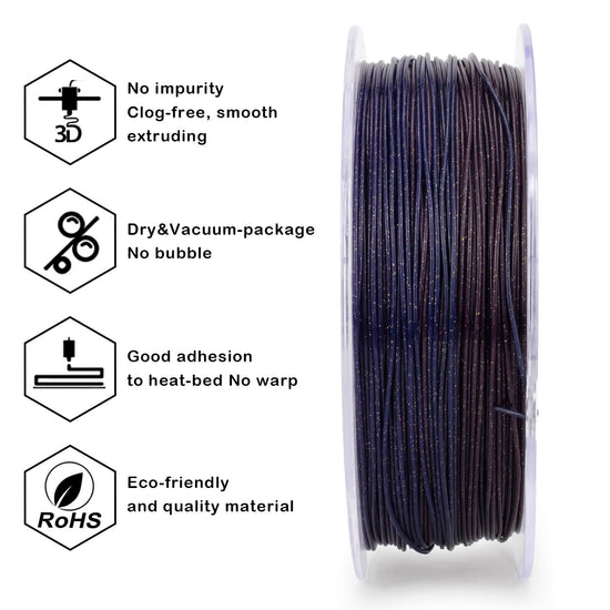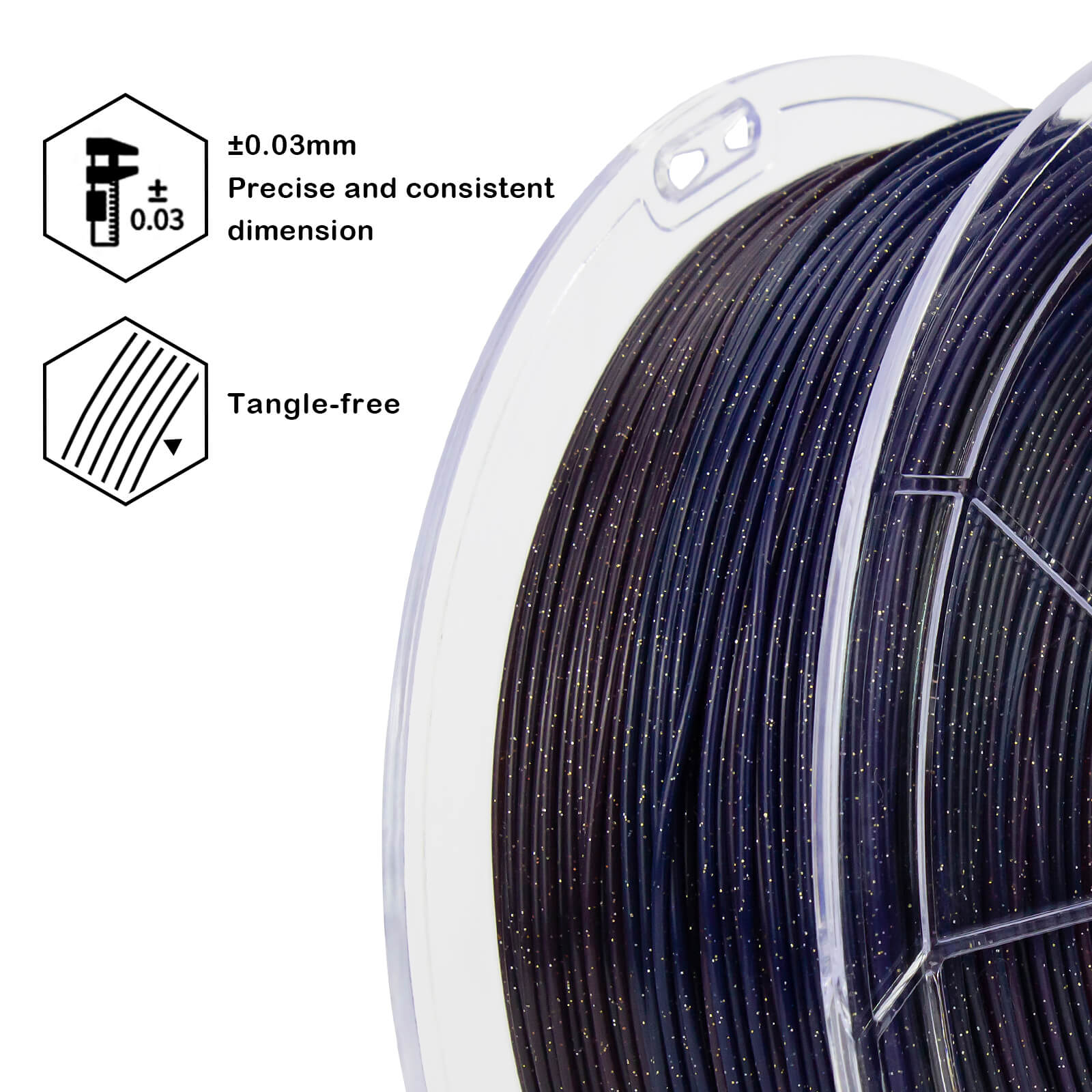 Nice starry filament for use in most 3D printers. Being a plastic reel, they are also suitable for printers like the Bambu P1S, etc. The adhesion is good, and the end result is pretty decent, too. No clogging from this filament so far.