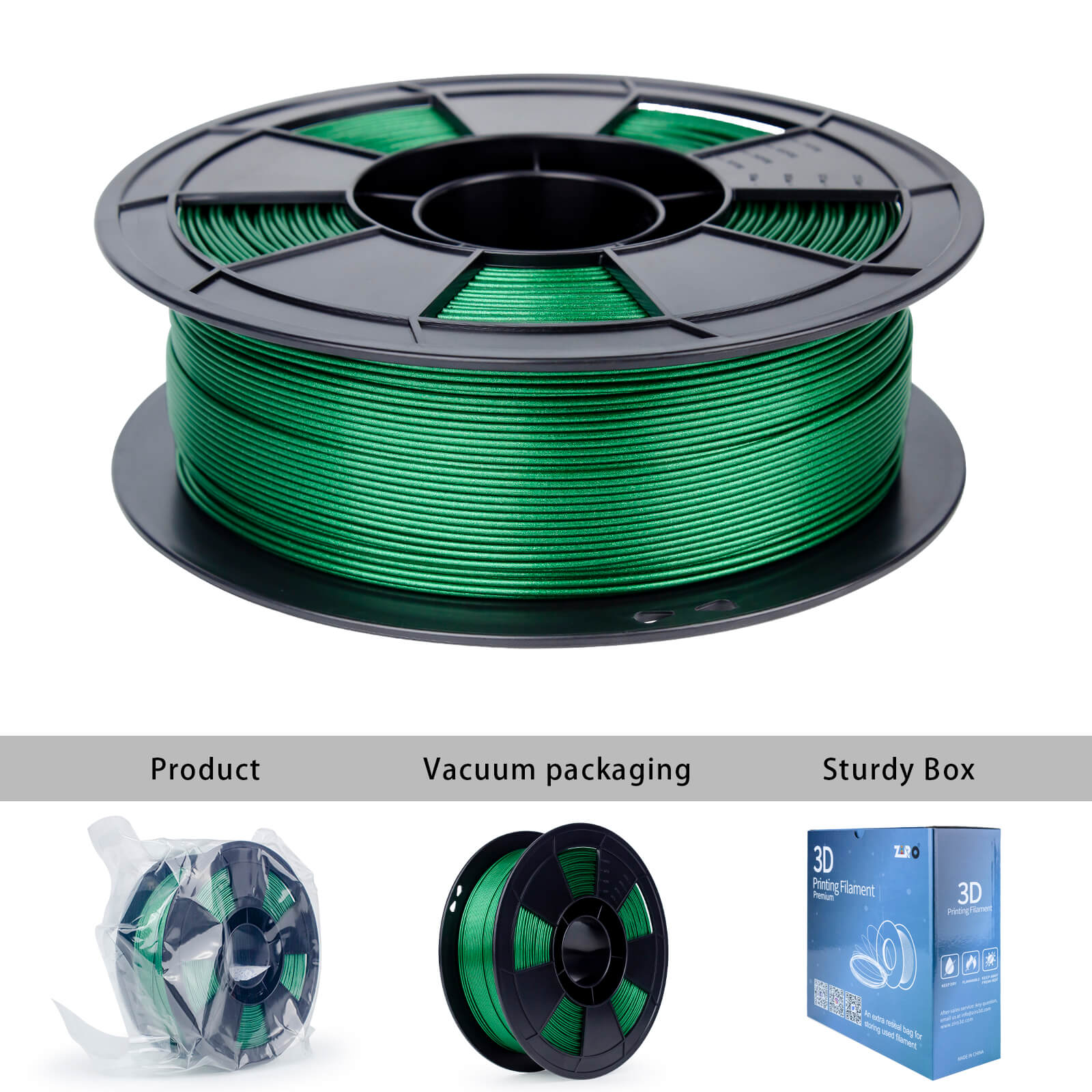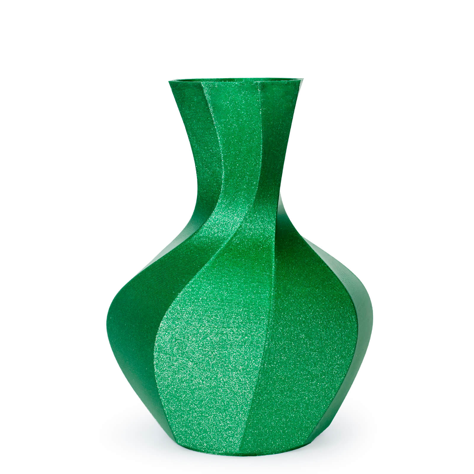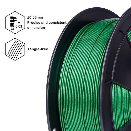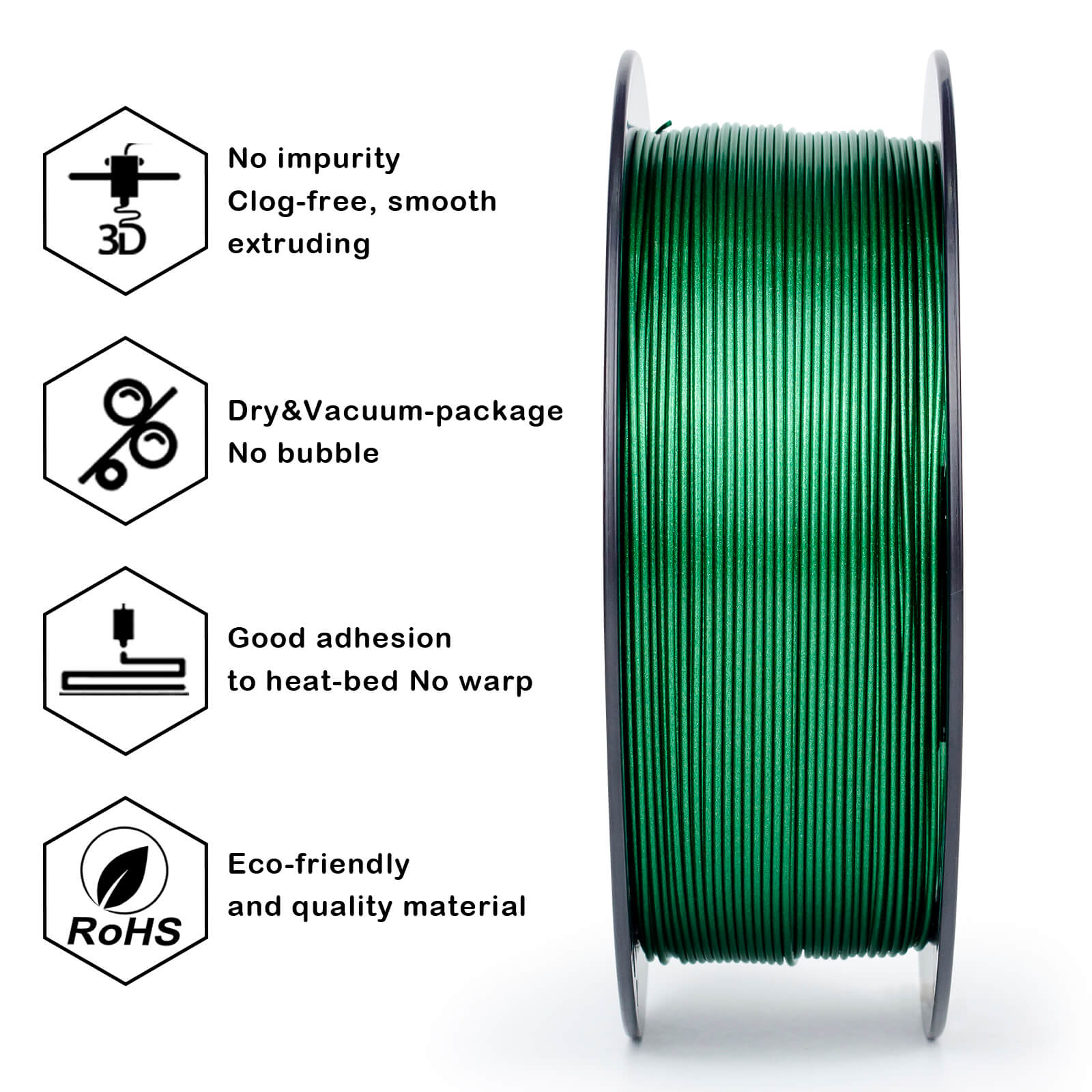 I got the Emerald color to print a Space Needle model. The product picture, filament, and prints all look slightly different shades of green with the prints looking the best and the product picture looking pretty close the end result (on my screen). It is a wonderful deep and sparkly material that looks great. Due to the recommended temps being slightly higher than other PLA, I upped my nozzle temp to 210C and kept a 60C bed. It is printing just like other PLA I've printed fresh out the bag and I haven't had to change any other settings. My brass 0.4mm nozzle is holding up for now and we'll see if the glitter clogs it after a few prints and hotend heating/cooling cycles.